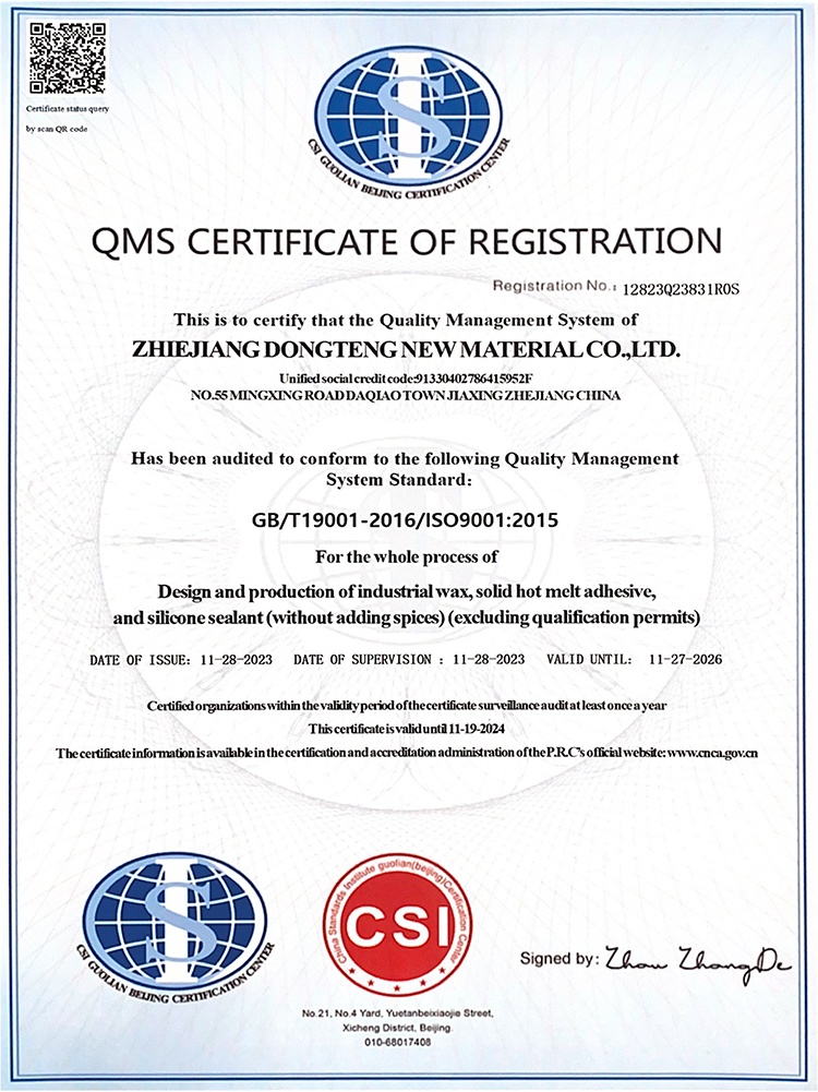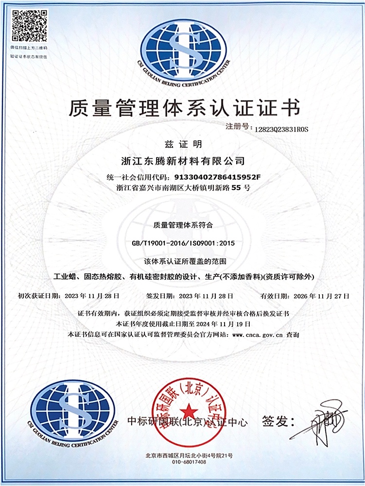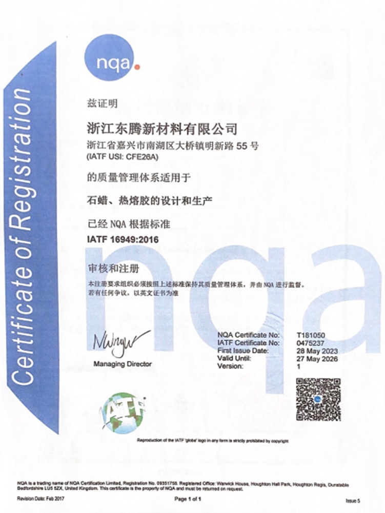 浙江東騰新材料有限公司成立于2006年,專注于特種蠟及膠粘劑的專業(yè)制造,經(jīng)過歷年的行業(yè)發(fā)展,產(chǎn)品的精耕細(xì)作,公司現(xiàn)已發(fā)展成為集研發(fā)、生產(chǎn)、銷售綜合一體化的實力企業(yè)。公司現(xiàn)研發(fā)人員13人。歷年來公司持續(xù)有效的運(yùn)行ISO9001、ISO14001、ISO45001、TS16949等管理體系。先后通過了浙江省科技型中小企業(yè)認(rèn)定、高新技術(shù)企業(yè)認(rèn)定、浙江省專精特新中小企業(yè)認(rèn)定。并曾獲科技創(chuàng)新先進(jìn)企業(yè)、嘉興市研究開發(fā)中心、浙江省守合同重信用企業(yè)等榮譽(yù)稱號。